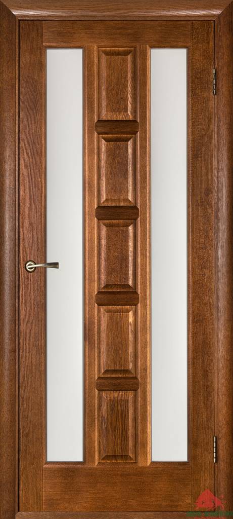 Коробочный брус - (с уплотнителем) и наличник изготовлены на основе массива сосны, шпонированного дубом.